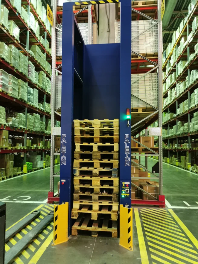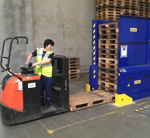 Все это в целом позволяет отказаться от ручного труда (сотрудникам не приходится тратить время на ручное складирование поддонов “в стопку” и ее разбор). Также экономится моторесурс тяжелой складской техники. Стопка паллет опускается диспенсером автоматически. Таким образом освобождается необходимое количество поддонов, предназначенных для перемещения гидравлической тележкой. Также освобождается место хранения поддонов.